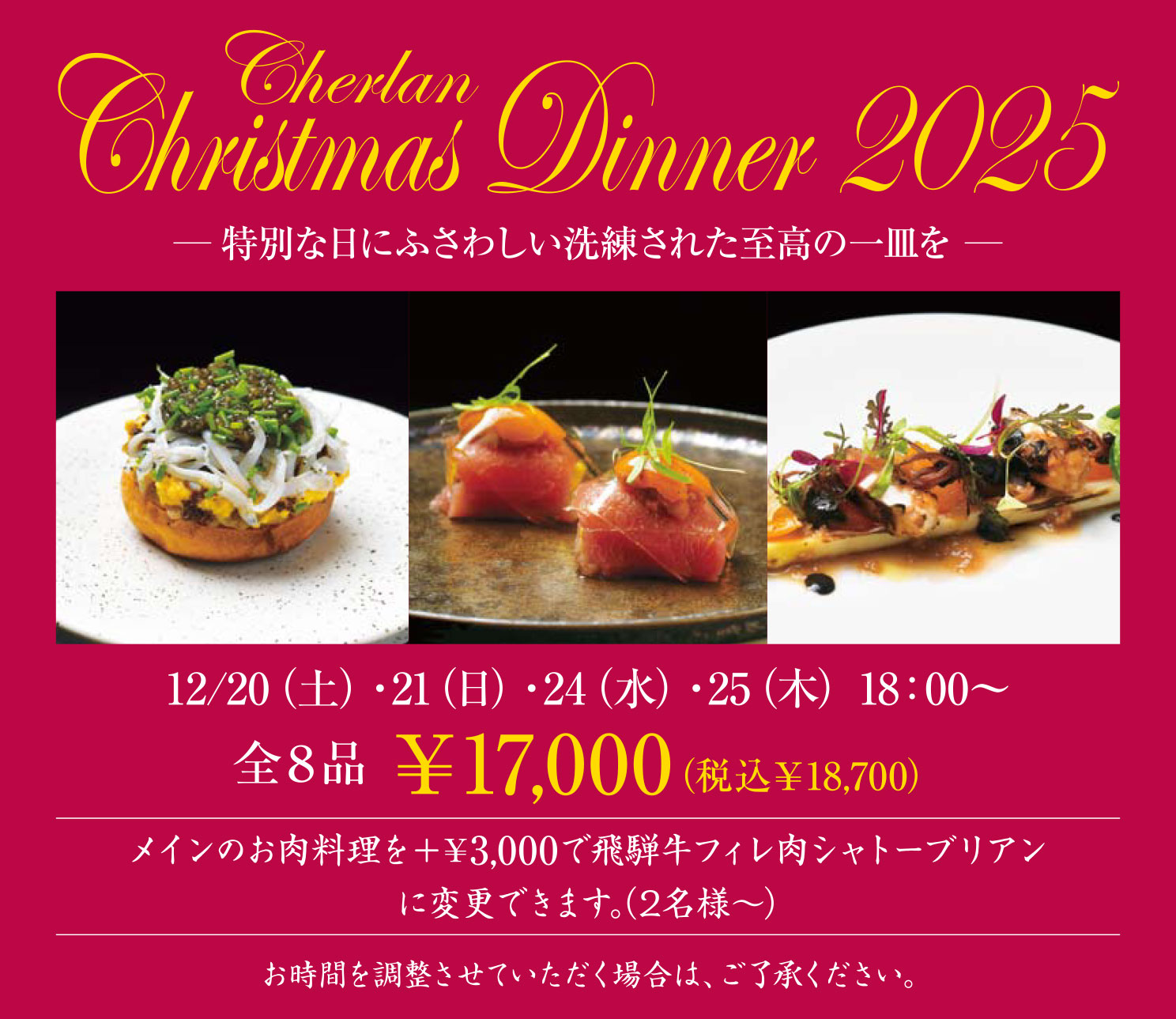 12月22)金)23(土).24(日).25(月) クリスマスディナー(ランチはお休みとなります)